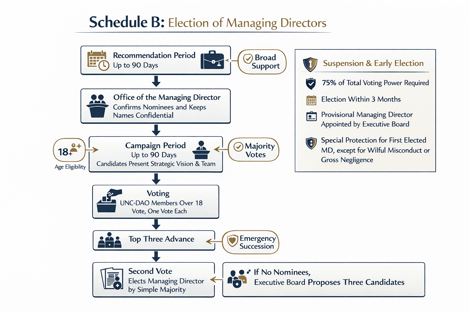 A majority of the members of the UNC-DAO exercising not less than seventy-five percent of the total voting power shall be required for any decision to suspend a Managing Director and to call for an election prior the next regular election of Managing Directors.