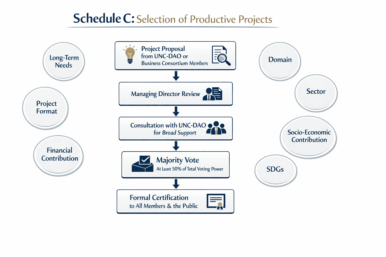 Decisions on matters pertaining to the selection of productive projects proposed by members of the UNC-DAO or members of the Business Consortium, other than those selected at the discretion of the Managing Director shall be subject to the following provisions :